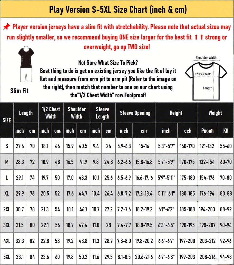 📌📌Player version jerseys have a slim fit with stretchability. Please note that actual sizes may run slightly smaller. so we recommend buying ONE size larger for the best fit. ⬆ ⬆ Strong or Overweight. Please Go TWO size up! ⬆ ⬆